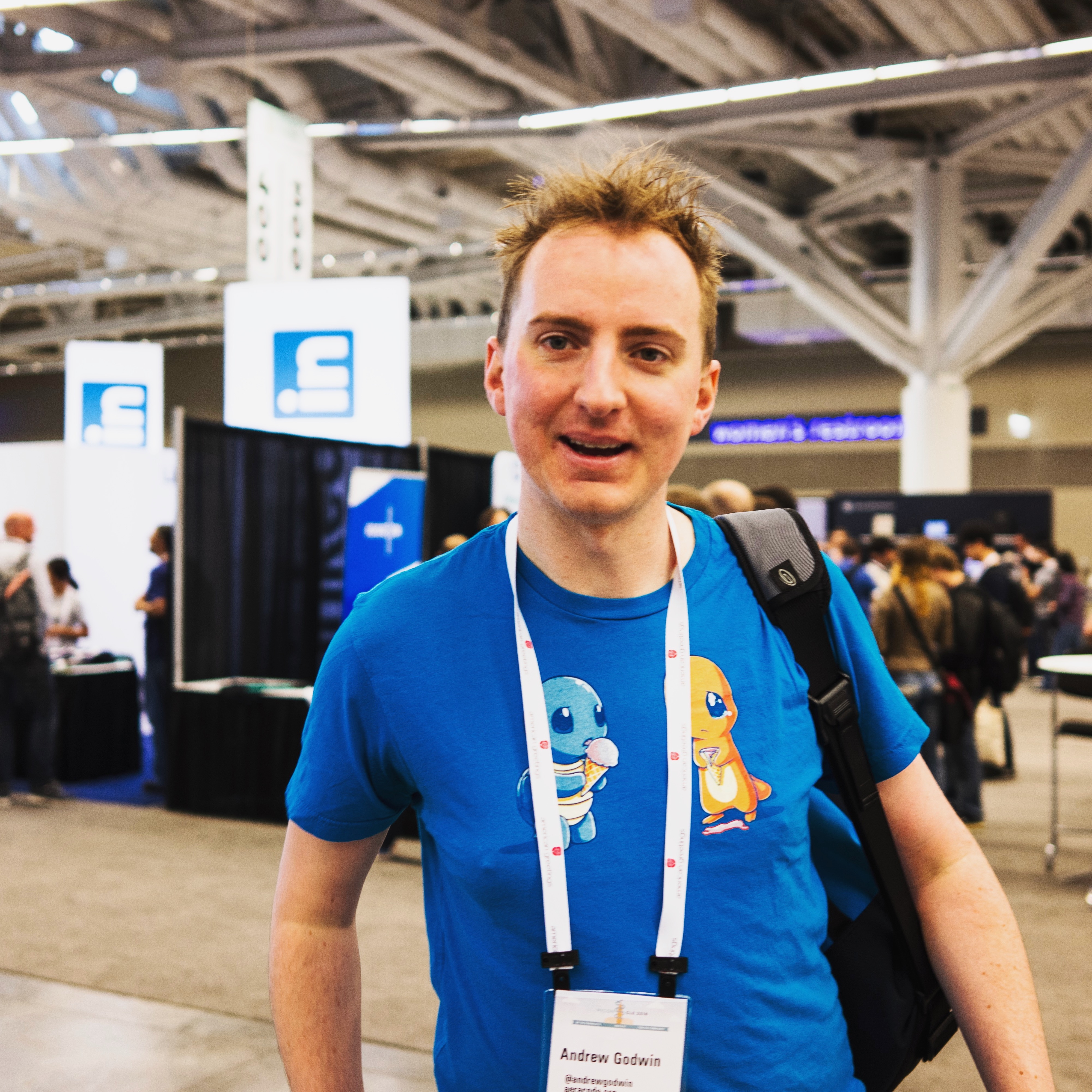 A young man stands confidently in a bustling conference hall, his blue t-shirt adorned with playful Pokémon characters adding a touch of whimsy to the professional environment. The lighting is bright and inviting, highlighting his friendly expression as he engages with the camera amidst blurred figures of attendees and event displays in the background. The overall mood is relaxed and approachable, capturing the vibrant energy of a community gathering.