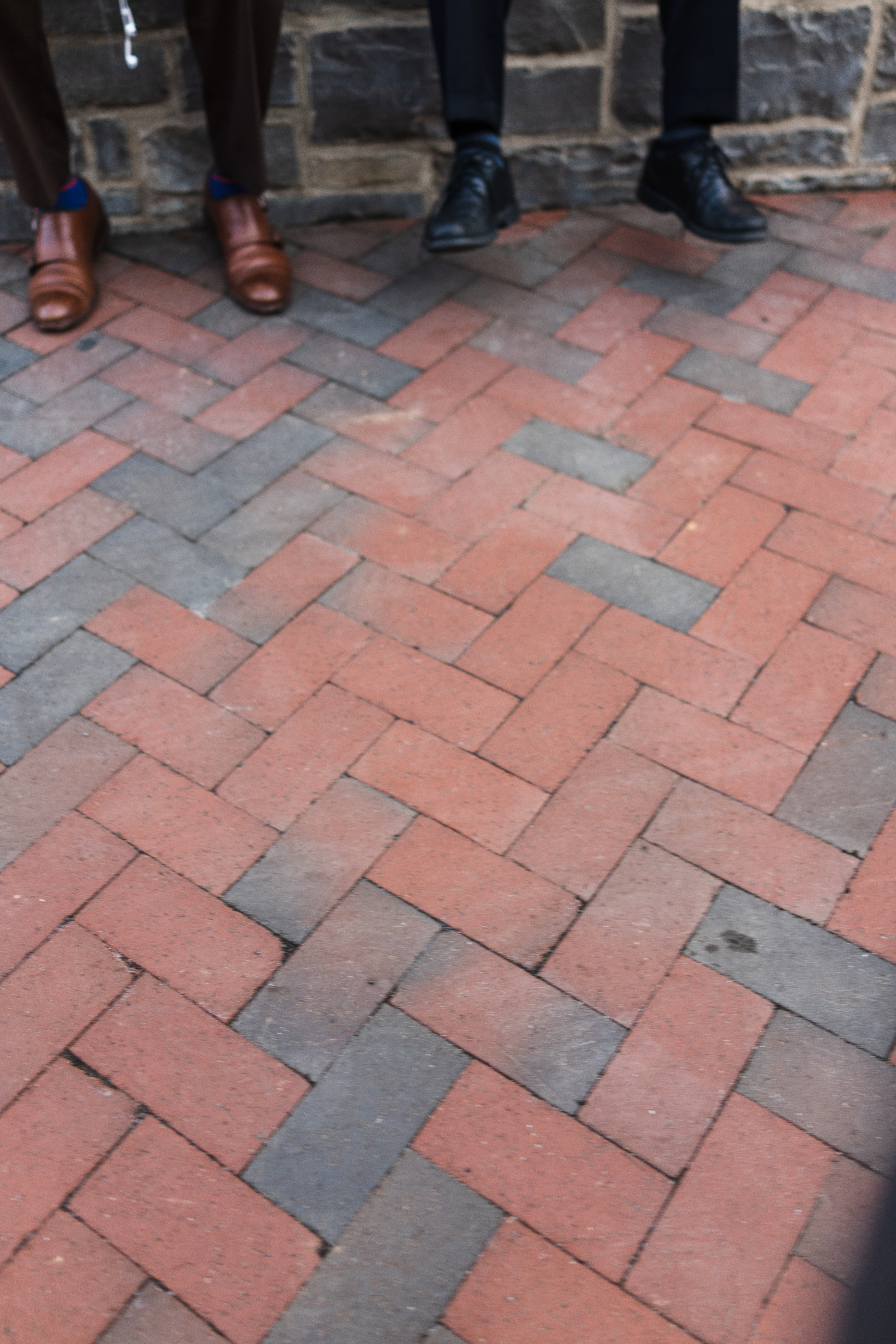 This photograph captures the lower halves of two individuals, their contrasting shoes resting on a textured brick path. The composition emphasizes the warm hues of the brown and red bricks, evoking a sense of quiet camaraderie. Soft lighting subtly delineates the figures, creating a serene mood that invites contemplation of the unseen stories above.