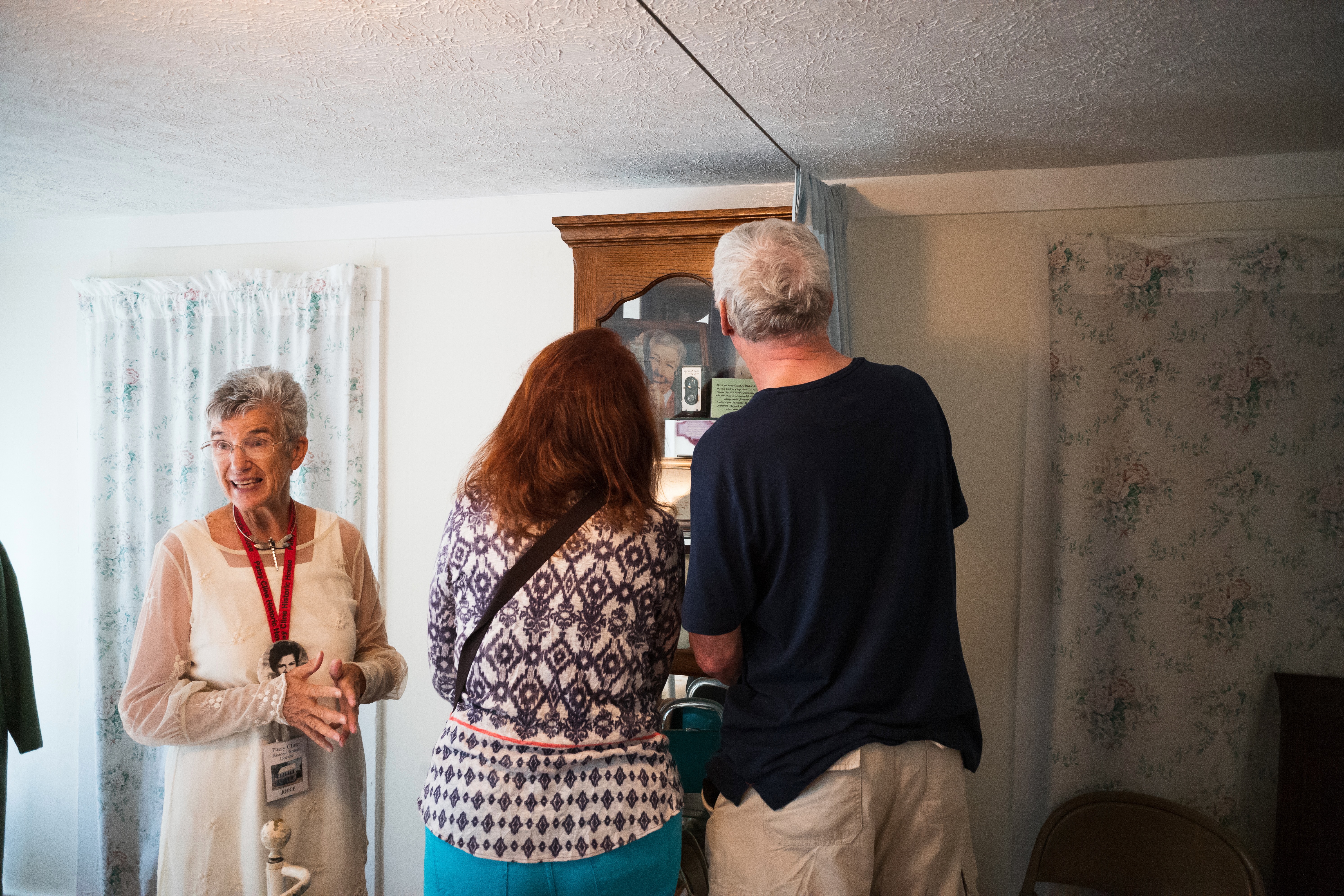 In a cozy, well-lit room, a lively guide enthusiastically shares stories while two visitors are captivated by a display inside a cabinet. The warm glow from the window highlights the curiosity and engagement on their faces, creating an inviting and nostalgic atmosphere. The contrast of their attentive expressions against the backdrop of vintage decor adds depth to this intimate moment.