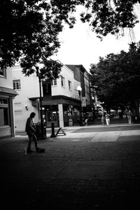 A lone figure stands on a quiet street corner, absorbed in their phone amidst the soft glow of streetlights. The photograph's monochrome palette emphasizes the somber mood and urban solitude, while the shadows and light interplay create a sense of depth. Surrounding the subject are quaint shops and a few pedestrians, adding to the atmosphere of peaceful urban life.