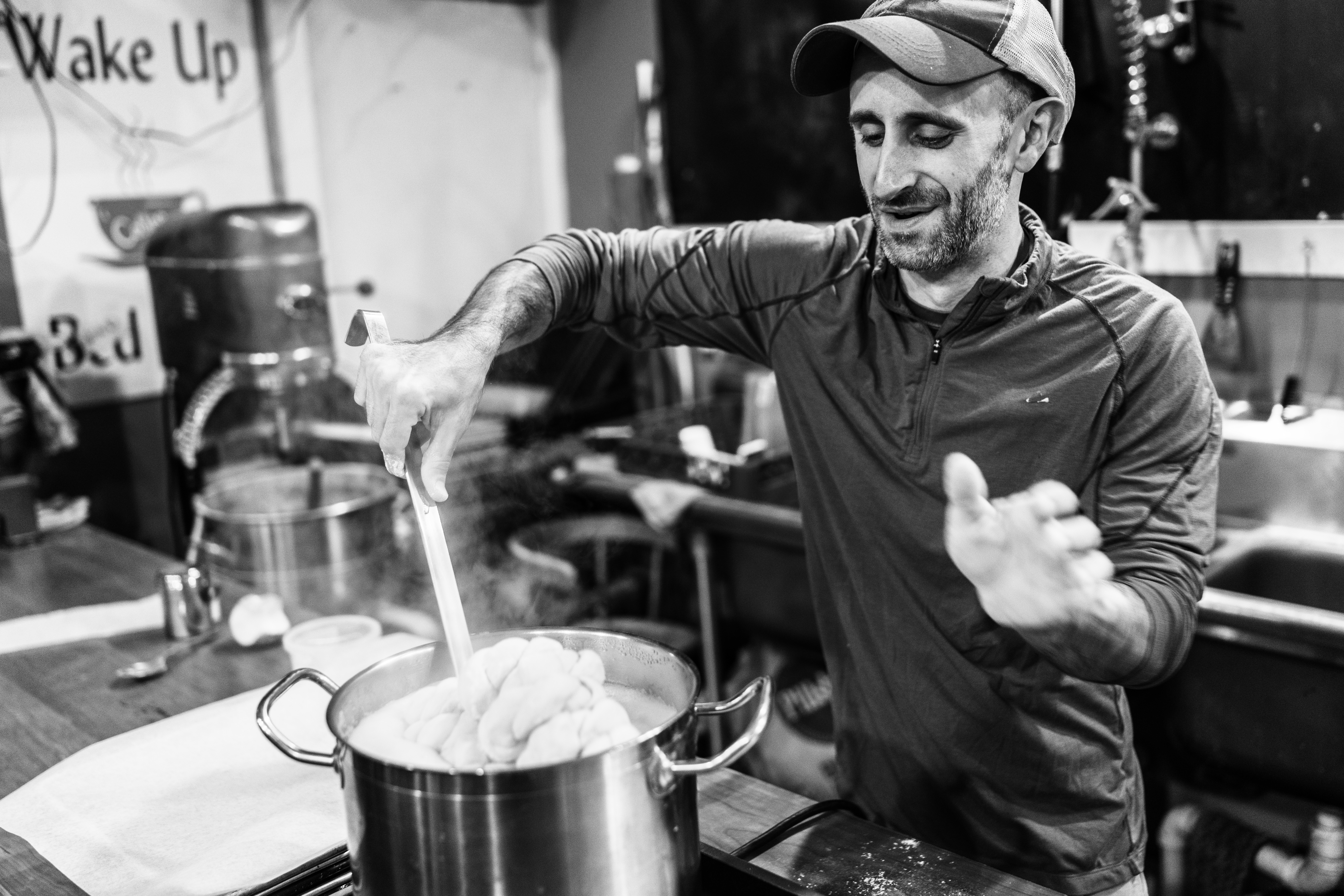 In a cozy kitchen, a chef stirs a pot of steaming dough, embodying focus and joy. The black and white tones enhance the atmosphere, capturing the essence of culinary creativity and dedication. Illuminated by soft ambient light, the scene conveys warmth and a sense of craftsmanship in motion.