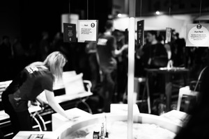 This monochromatic photograph captures a moment at an event, focusing on a woman attentively wiping down a table while vibrant informational cards dangle above. The shallow depth of field blurs the bustling crowd in the background, creating a sense of intimacy amid the lively atmosphere. The contrasting lighting adds a dramatic effect, emphasizing the subject's concentration and the dynamic environment surrounding her.