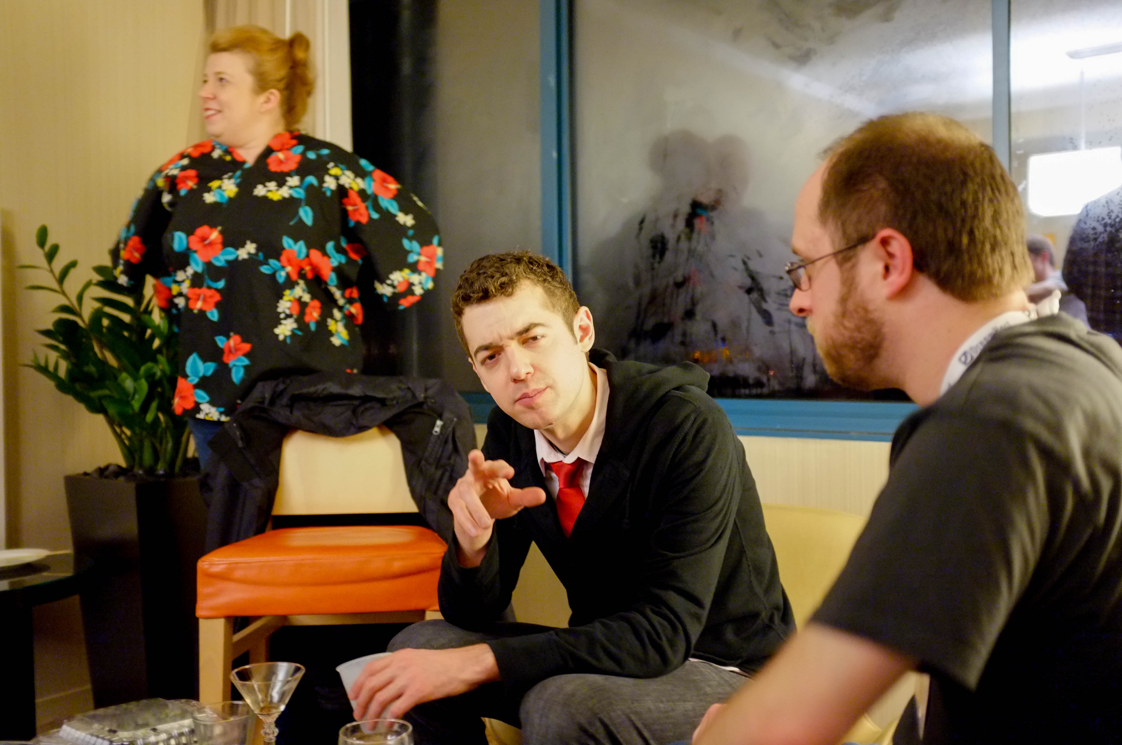In a cozy indoor setting, three individuals engage in animated conversation, with one man in a sharp black suit and red tie gesturing expressively, while another man listens intently. A woman stands in the background, her vibrant floral blouse contrasting with the muted tones of the other two, adding a lively energy to the scene. The soft, warm lighting and blurred background hint at an intimate gathering, evoking a sense of connection and camaraderie among friends.