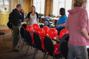 In a warm, inviting setting, a group of individuals engages in lively conversation amidst a cheerful display of red balloons. The soft natural light streaming through large windows casts a friendly glow, enhancing the upbeat atmosphere of preparation or gathering. The focus on interactions suggests a sense of community and shared joy, hinting at a forthcoming celebration.
