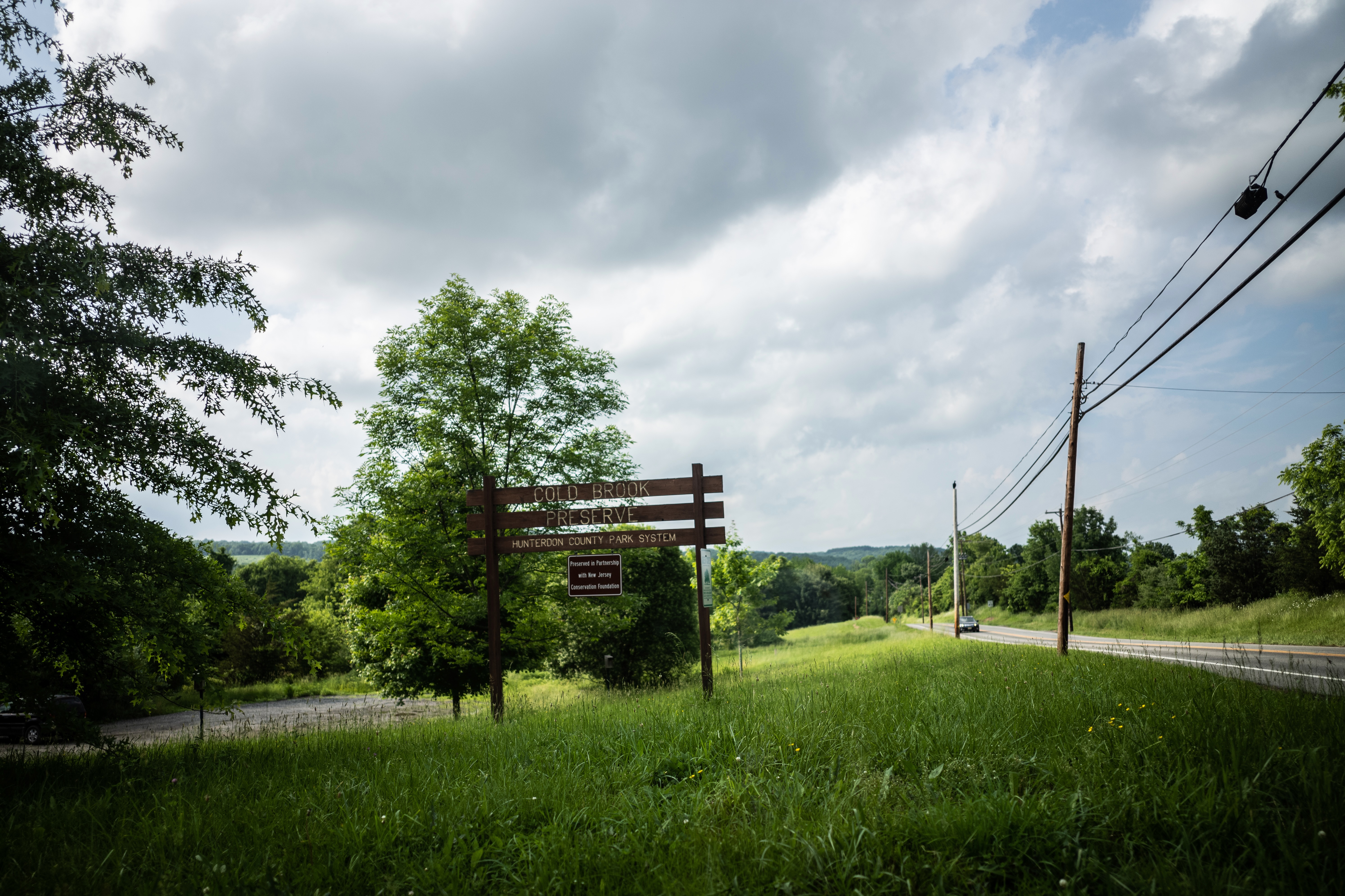 This photograph captures a serene view of a park entrance, framed by lush greenery and a cloudy sky. The sign for Cold Brook Preserve stands tall amidst the vibrant grass, inviting exploration into the tranquility of nature. Soft lighting from the diffused clouds adds to the calm and inviting atmosphere, hinting at a peaceful escape.
