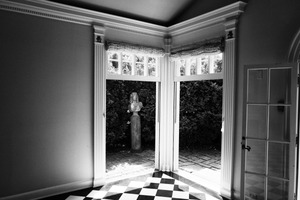 In a monochromatic scene, an elegantly designed room opens up to a lush garden, framed by light streaming through tall windows. A solitary statue stands sentinel in the doorway, creating a tranquil interplay between the indoors and nature. The juxtaposition of patterned floor tiles and soft greenery evokes a sense of serenity and contemplation.