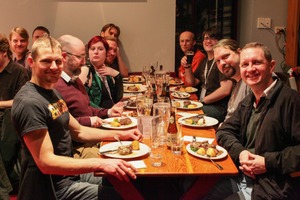 A lively dinner gathering captures a diverse group of individuals seated at a long wooden table, each engrossed in conversation while enjoying a hearty meal. The warm lighting adds an inviting atmosphere, enhancing the sense of camaraderie among the participants. Their varied expressions, ranging from smiles to contemplative looks, evoke a shared moment of joy and connection.