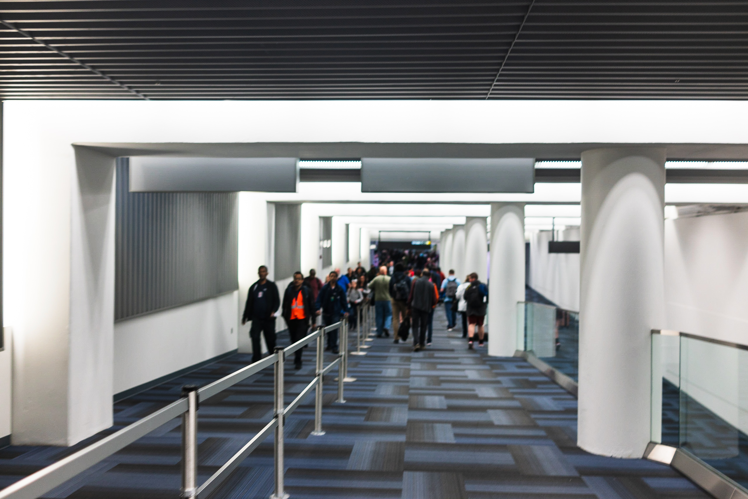 A bustling corridor captures the movement of a diverse crowd headed towards an unknown destination. The stark white walls and overhead lights create a clinical yet bright atmosphere, juxtaposed with the varied textures of the floor and the individuals in line. Shadows and highlights play along the pillars, accentuating the sense of depth and urgency in the scene.