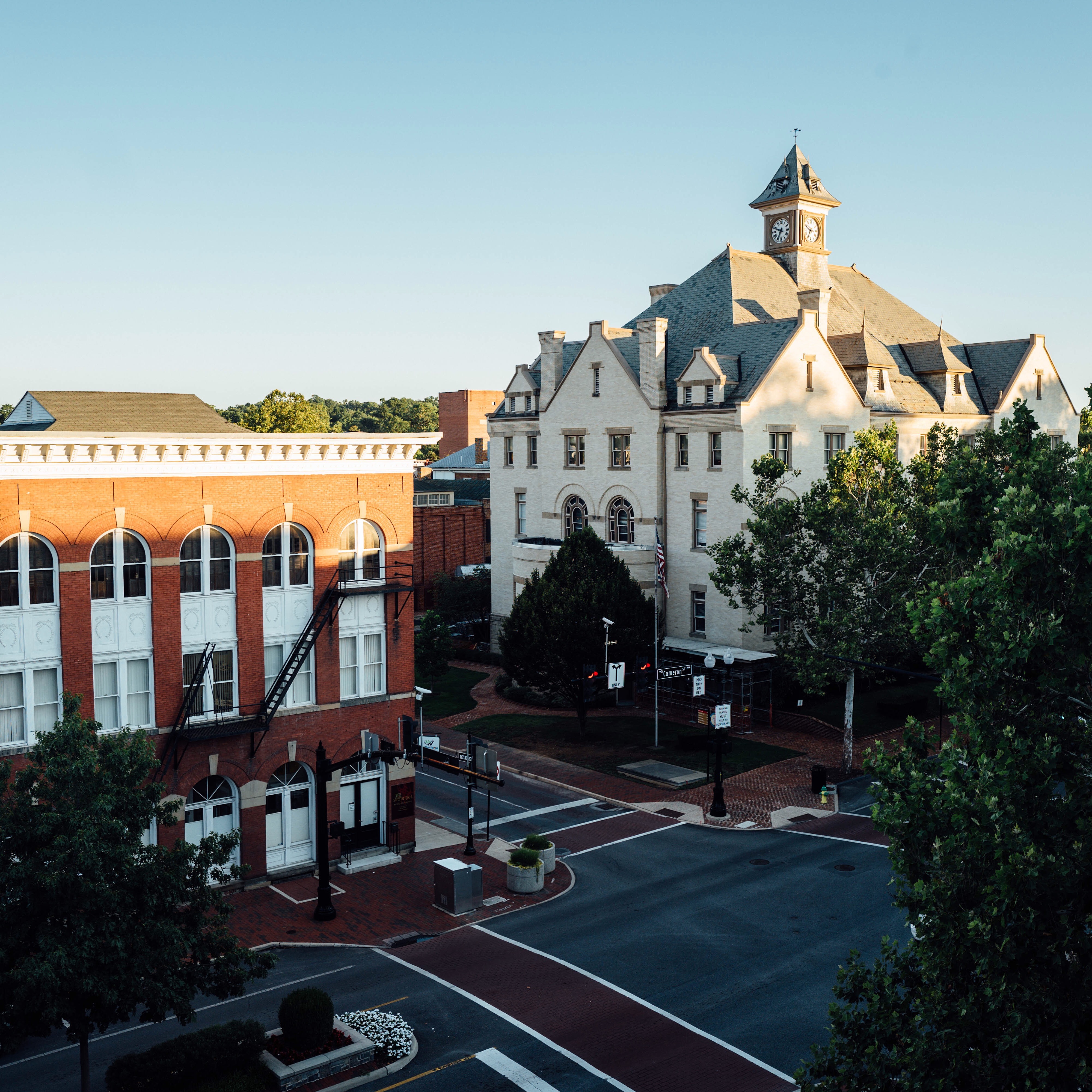 Bathed in soft morning light, this photograph captures a quaint town square with a blend of historical architecture. The juxtaposition of the red brick building and the stately clock tower creates a harmonious balance, inviting viewers to explore the serene atmosphere. Lush trees frame the streets, enhancing the inviting charm of this picturesque setting.