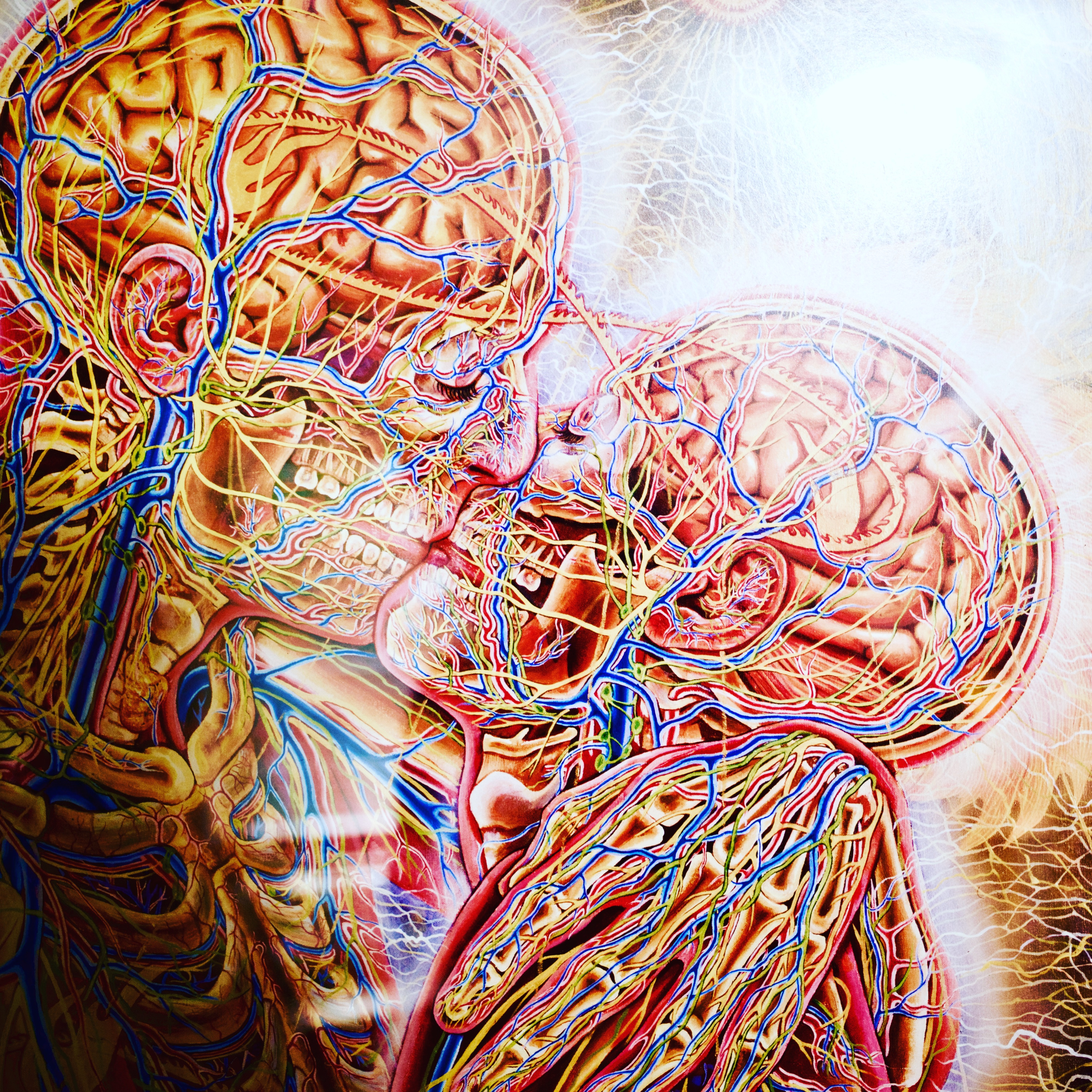 This striking artwork portrays two intertwined human figures, their intricate vascular systems vividly illustrated in vibrant colors. The mood evokes a sense of intimacy and interconnectedness, highlighted by dramatic lighting that emphasizes the detailed anatomy. The composition draws the viewer's eye to the complex patterns of veins and arteries, reflecting the delicate balance between life and connection.