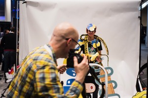 In a vibrant setting, a photographer captures a whimsical moment as a subject adorned with playful decorations poses. The backdrop is bright, contrasting the subjects’ cheerful expressions, creating a lively and engaging atmosphere. The composition emphasizes the interaction between the photographer and the model, highlighting the joy of creativity and spontaneity.