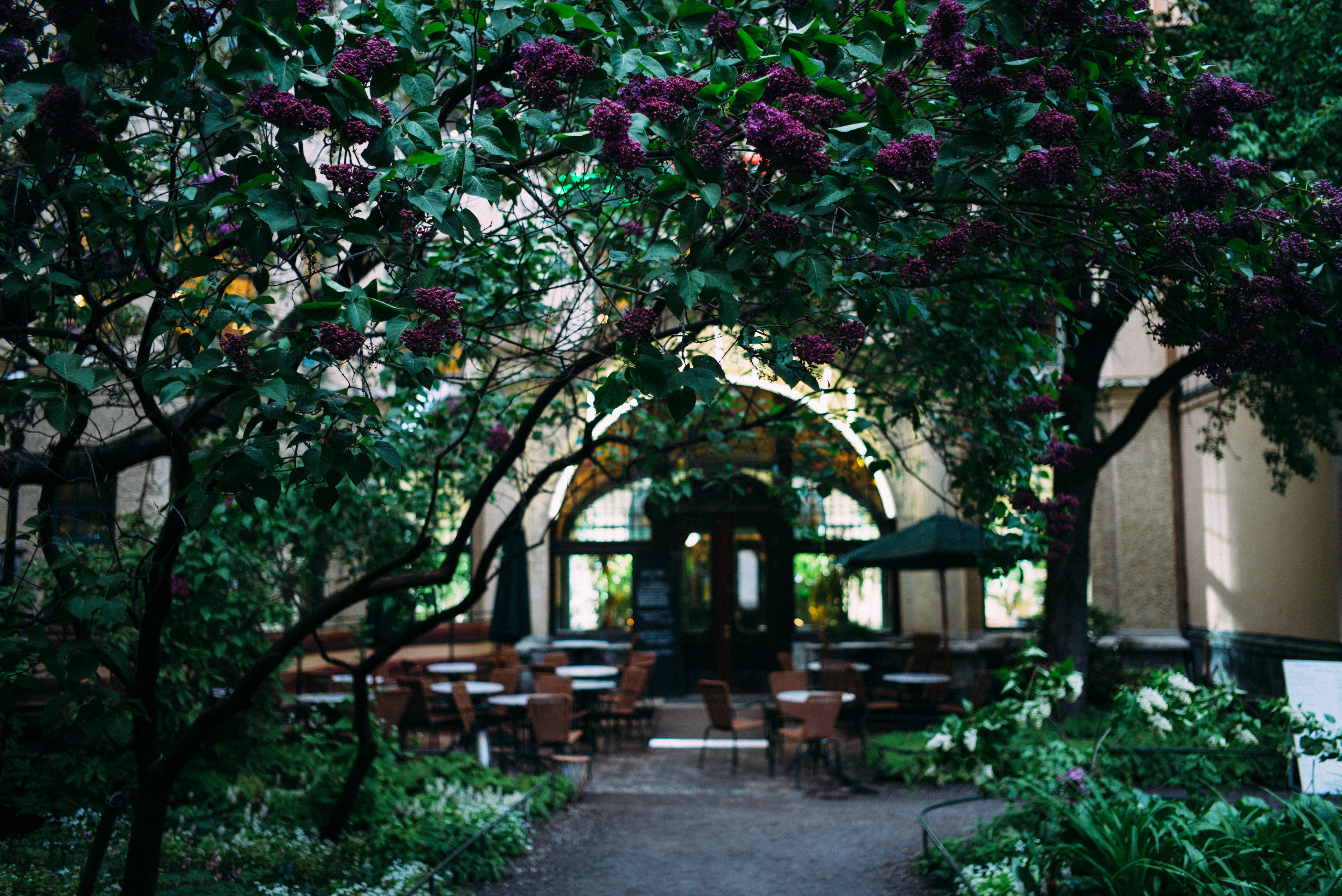 A secluded corner of a garden invites tranquility, framed by lush green leaves and vibrant purple blooms. Soft, diffused lighting enhances the serene atmosphere, illuminating the empty tables and inviting a sense of quiet introspection. The composition draws the eye through the archway, hinting at a peaceful retreat from the surrounding bustle.
