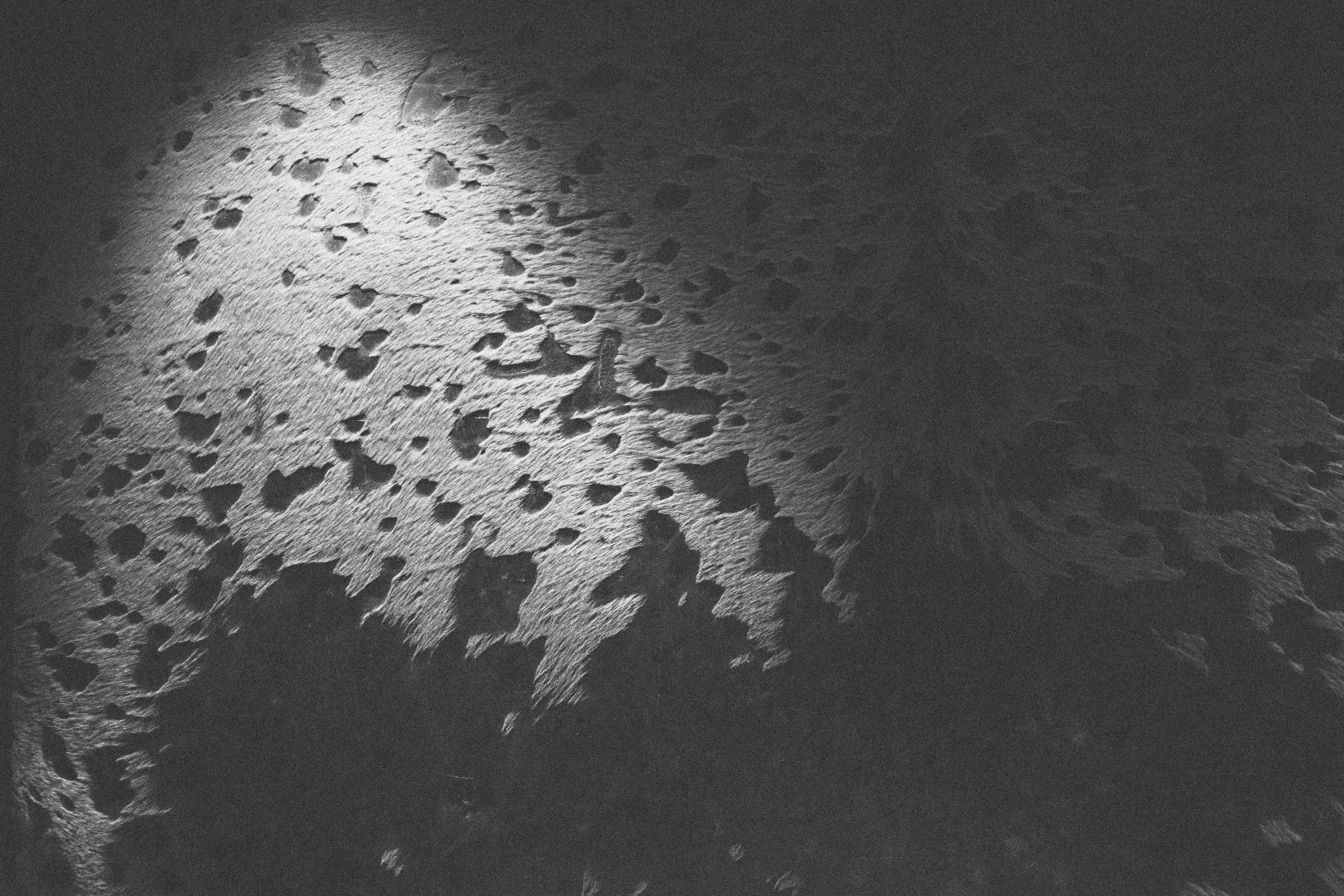 The photograph captures a textured surface illuminated by a soft light, creating an interplay of highlights and deep shadows. The scattered shapes and patterns evoke a sense of organic fluidity, almost resembling a natural landscape. The monochromatic palette enhances the mood of mystery and introspection, inviting the viewer to explore the depth of the surface details.