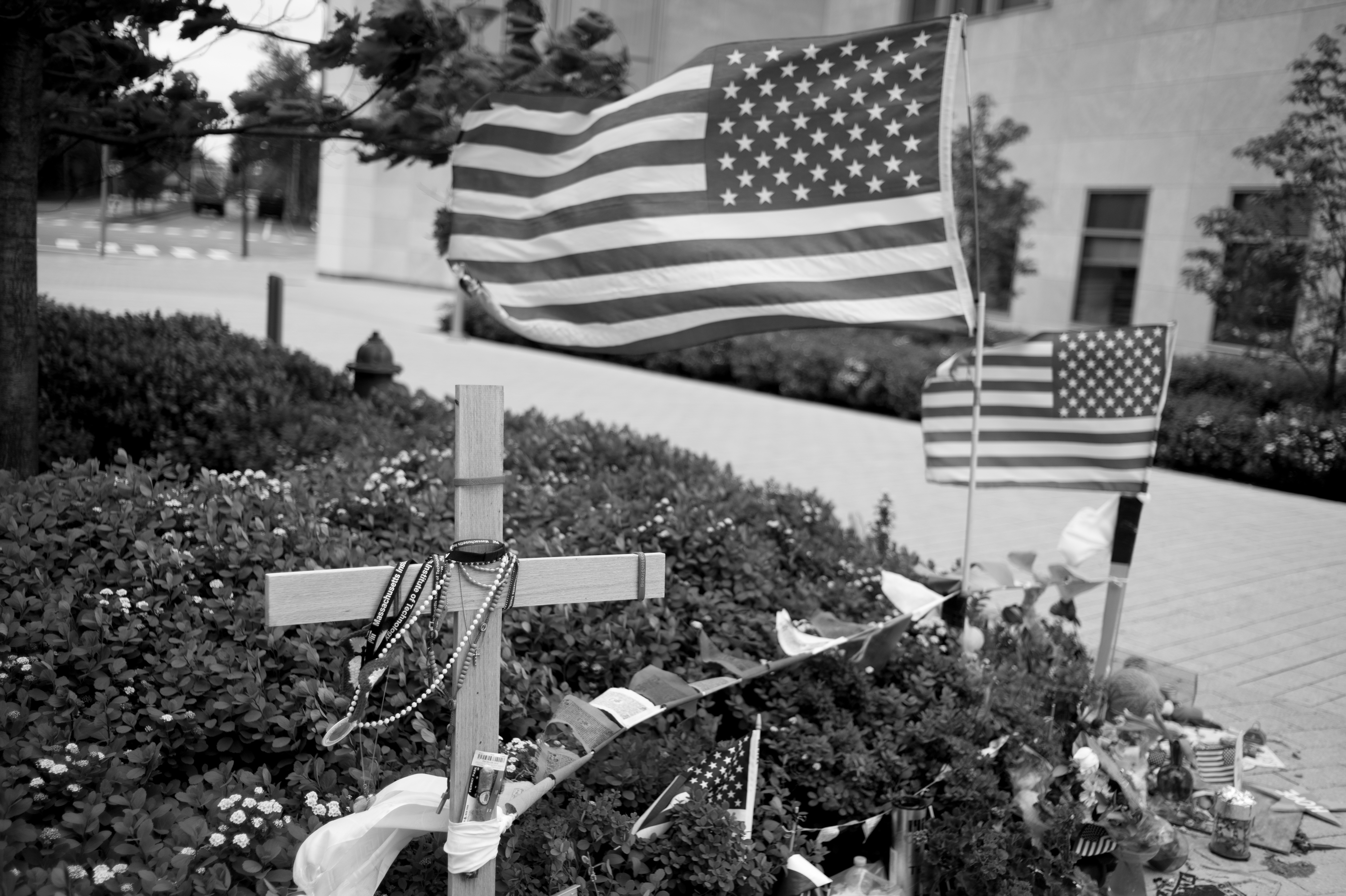 In this poignant black-and-white photograph, a simple wooden cross stands adorned with beads, amidst a sea of plants, while American flags flutter gently in the background. The composition evokes a solemn atmosphere, capturing a moment of remembrance and tribute. The soft lighting enhances the emotional weight, drawing attention to the memorial's symbolism and the deep sense of loss it represents.