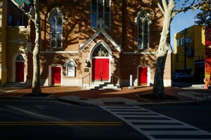 The photograph captures a striking brick church with bold red doors, standing prominently at the intersection of a sunlit street. The play of light and shadows creates a serene mood, highlighting the architectural details while a juxtaposition of textures from the nearby trees adds depth. The calm ambiance invites reflection, making this scene an intimate glimpse into a tranquil urban moment.