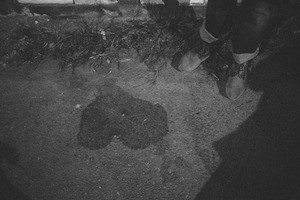 The photograph captures a pair of shoes resting at the edge of a darkened street, with a unique puddle shape mirroring their outline. Low lighting enhances the mood of mystery and solitude, while the textured pavement and overgrown grass add depth to the scene. The contrasting light and shadow create an intriguing interplay, inviting curiosity about the narrative behind this moment.
