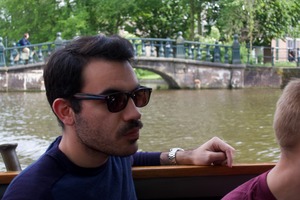 The photograph captures a young man in sunglasses, lost in thought as he gazes out over a tranquil waterway. The lush greenery in the background, along with the soft, diffused light, creates a serene and reflective mood, while the distant bridge adds depth to the composition. The balance of focus between the subject and the scenic backdrop suggests a moment of quiet contemplation amidst a lively setting.