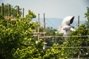 This photograph captures a vibrant green foreground dominated by leafy branches, contrasting with the industrial silhouettes of power lines and structures in the background. The scene evokes a quiet yet dynamic mood, where nature and urban elements coexist. Soft, natural lighting enhances the greenery while subtly illuminating the industrial features, creating a layered composition that invites contemplation of the relationship between the two realms.