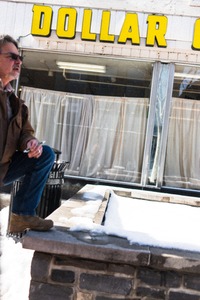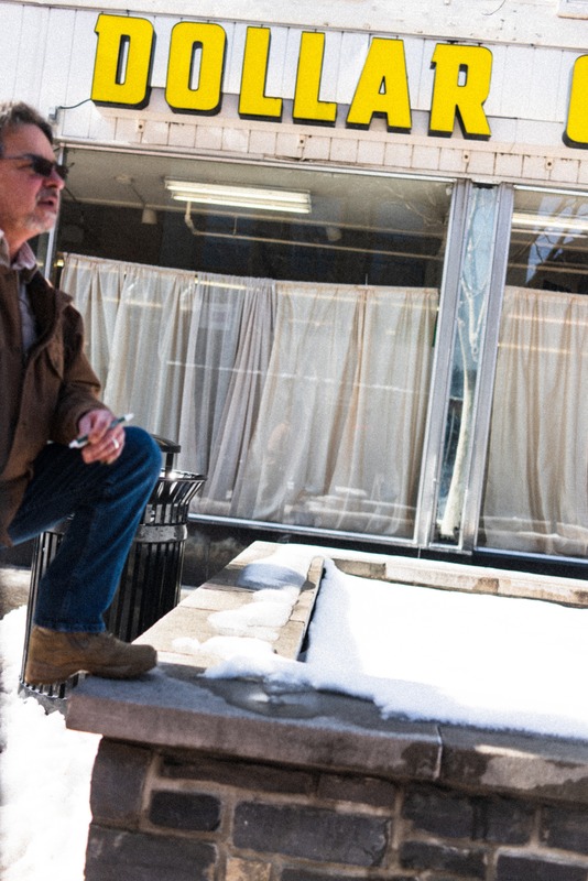 A man sits casually on a stone ledge, exuding a sense of contemplation against the backdrop of a dollar store. The bright yellow sign above him contrasts with the soft white snow lingering on the ledge, creating a playful yet tranquil mood. Warm sunlight bathes the scene, enhancing the relaxed atmosphere of an ordinary day spent in thought.