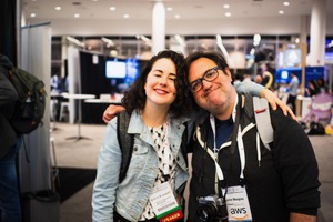 This candid photograph captures two friends beaming with joy as they embrace in a lively conference setting. The soft, diffused lighting enhances the warm atmosphere, while the blurred background showcases the bustle of the event, adding to the sense of camaraderie and celebration.