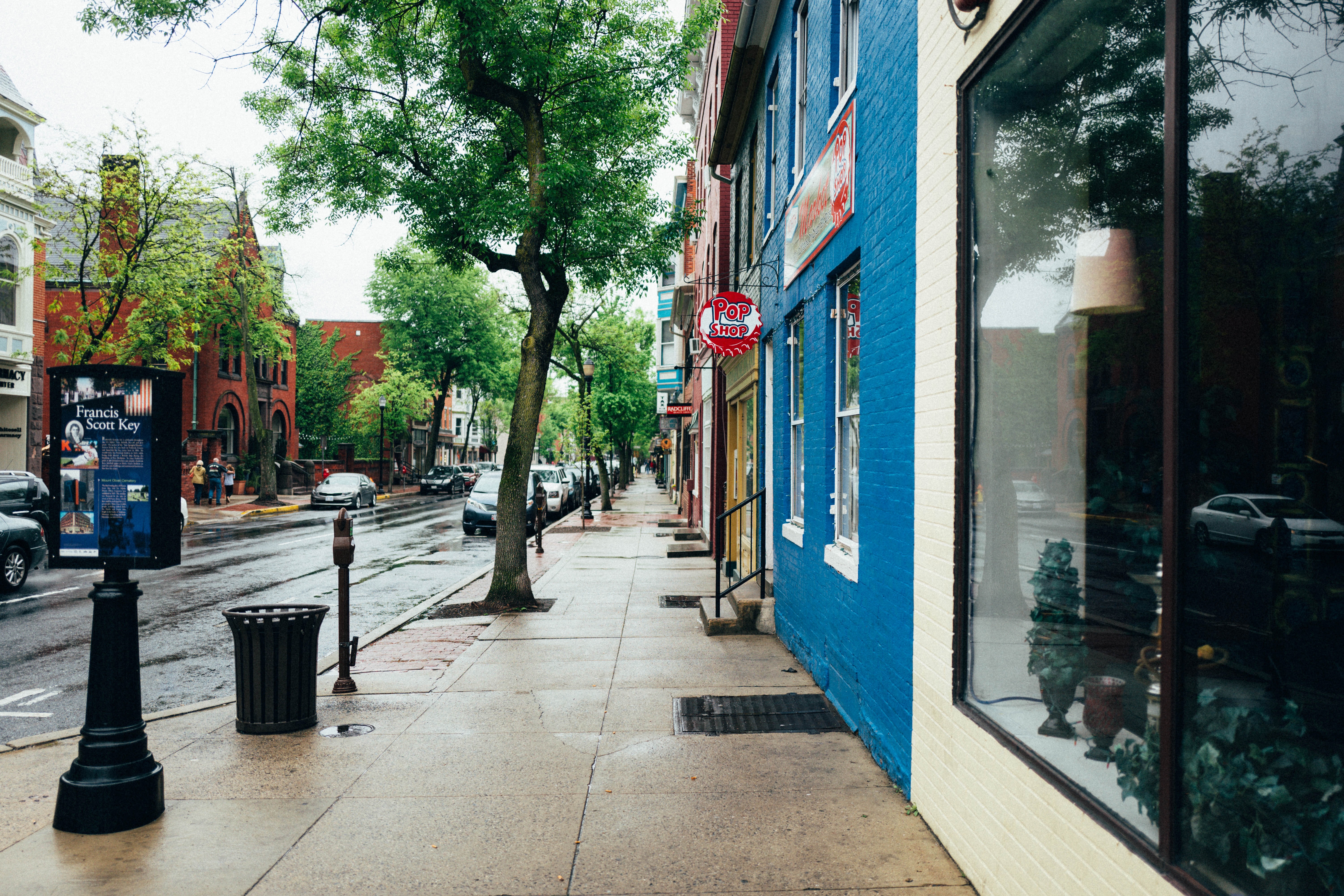 The photograph captures a quaint street scene drenched in rain, highlighting a vibrant palette of blue and yellow buildings juxtaposed against the wet sidewalk. Lush greenery and the reflections in shop windows add a lively yet mellow atmosphere, while the overcast sky softens the light to evoke a cozy, introspective mood. The composition invites the viewer to wander down the picturesque avenue, evoking a sense of tranquility and charm.
