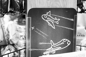 In a cozy, bustling space, two hand-drawn airplanes glide across a chalkboard, their whimsical trails suggesting freedom and adventure. The muted tones of black and white create a nostalgic mood, while the surrounding snacks hint at a casual atmosphere. The composition draws the eye to the playful sketches, contrasting sharply against the cluttered backdrop of travel-themed treasures.