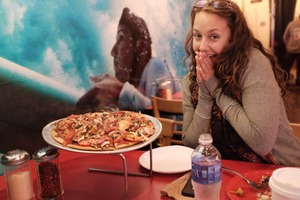 In a vibrant eatery, a young woman beams with excitement, her hands clasped in delight as she gazes at a beautifully presented pizza. The warm lighting casts a cozy glow, complementing the inviting colors of the food and surroundings, creating a fun and energetic atmosphere. A large mural in the background enhances the scene, adding a sense of adventure to the moment.