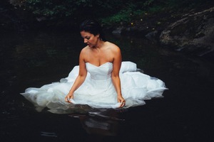 A woman in a delicate white dress sits gracefully in a tranquil pool, her reflection shimmering in the water. The surrounding lush greenery creates an intimate and serene atmosphere, while soft, diffused light casts gentle shadows on her figure. The composition captures both vulnerability and strength, evoking a sense of mystery and calm.