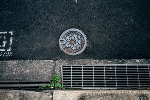 The photograph captures a circular manhole cover adorned with a floral design, set against the textured asphalt of a city street. Light filters down, creating a contrast between the cool tones of the pavement and the warm hues of the metal. A small patch of greenery peeks from the edge, adding a touch of nature amidst the urban backdrop, evoking a sense of resilience and beauty in the mundane.