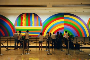A vibrant, abstract mural bursts with color behind a group of travelers waiting at a hotel reception. The juxtaposition of vivid hues creates a lively atmosphere, contrasting with the steady anticipation of those in line. Soft overhead lighting enhances the cheerful tones, inviting both energy and relaxation in this modern space.
