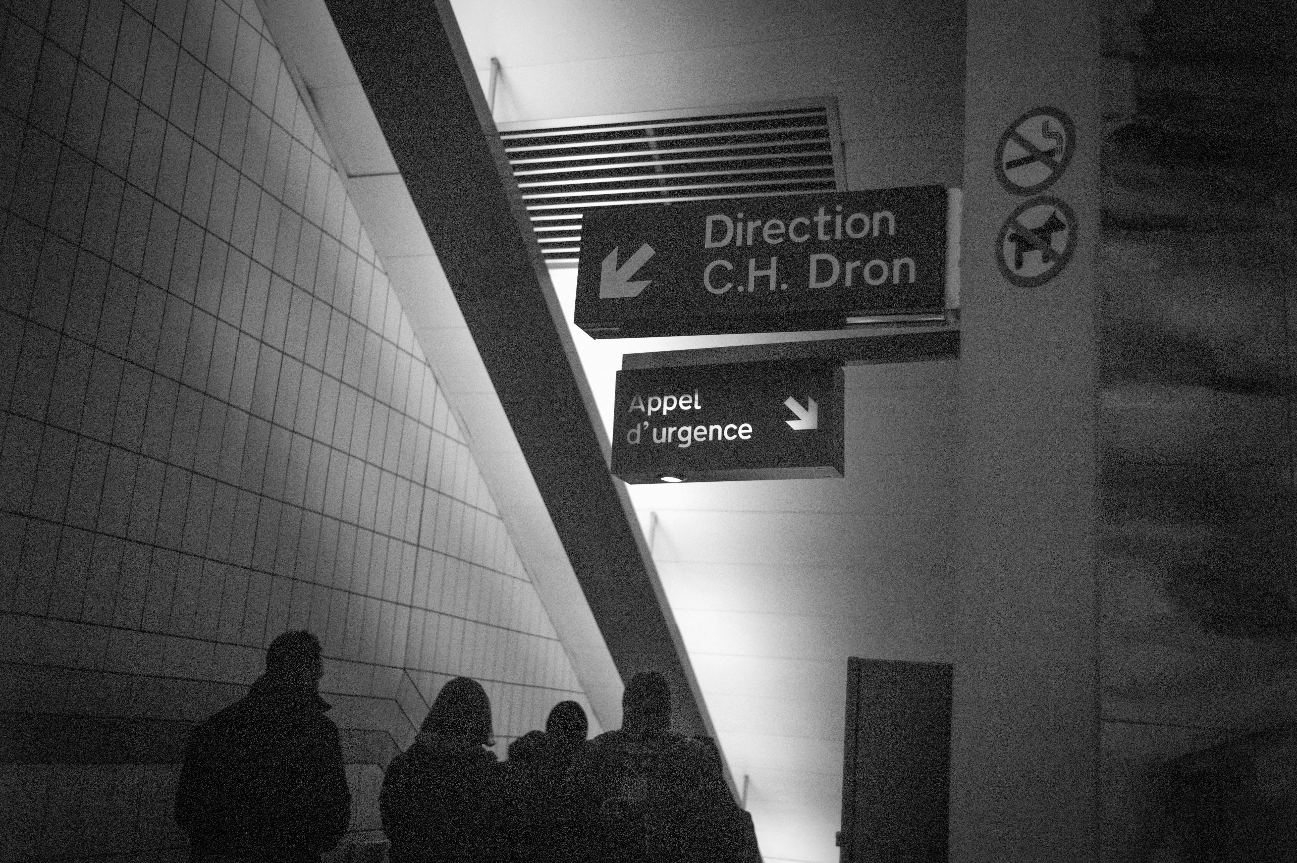 This photograph captures a group of figures descending a staircase in a stark, modern environment, illuminated by stark overhead lighting. The directional signs, contrasting against the dark silhouettes of the individuals, evoke a sense of urgency and purpose. The monochromatic tones create a moody atmosphere, suggesting both uncertainty and movement towards a defined destination.