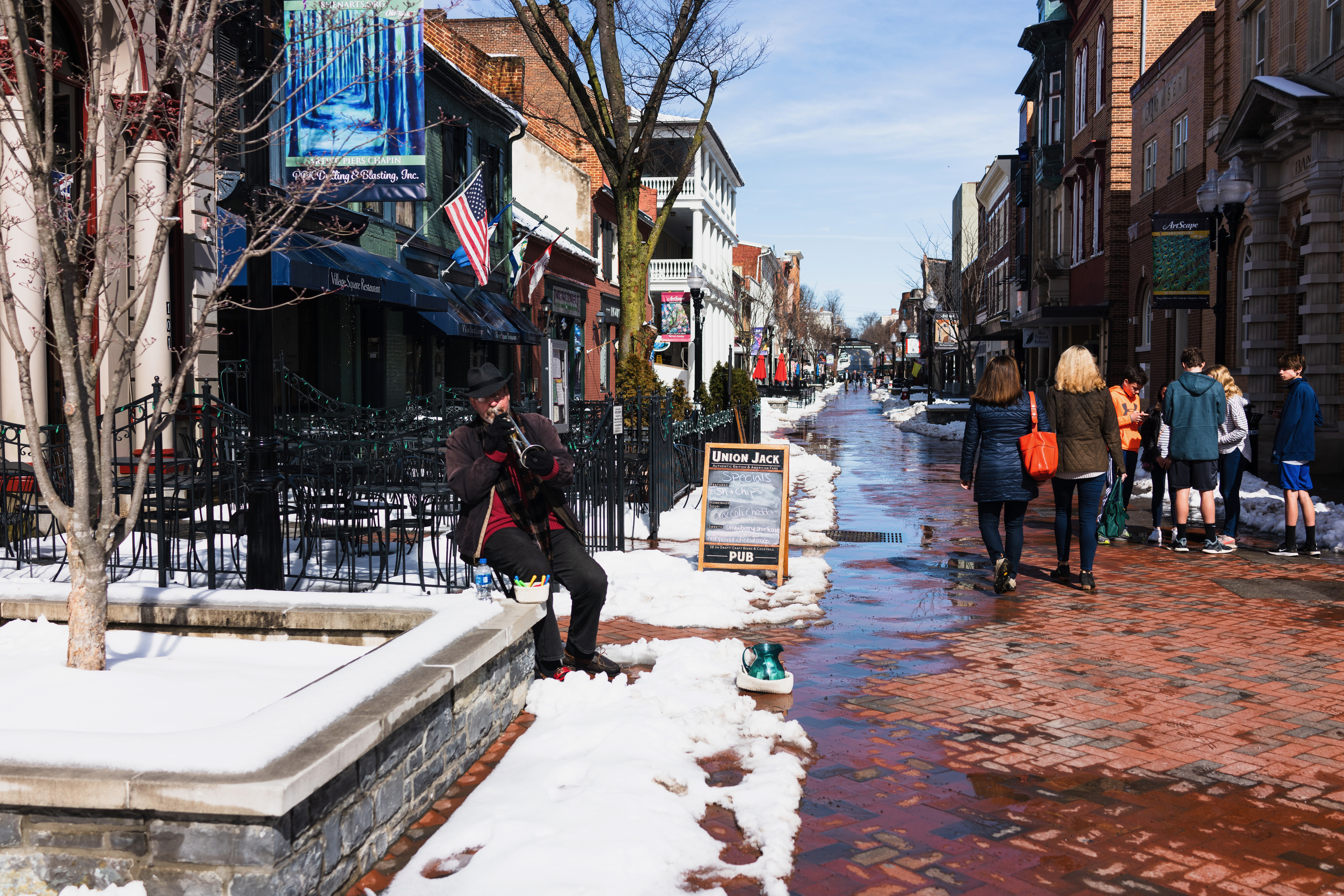 A street musician plays a soulful tune amidst a winter scene, where remnants of snow contrast with cobblestone paths. The sunlight glimmers on melted puddles, casting a warm glow over the vibrant storefronts and casual pedestrians, creating a lively yet serene atmosphere. The juxtaposition of the musician's solitude and the bustling crowd evokes a sense of community and reflection in the crisp air.