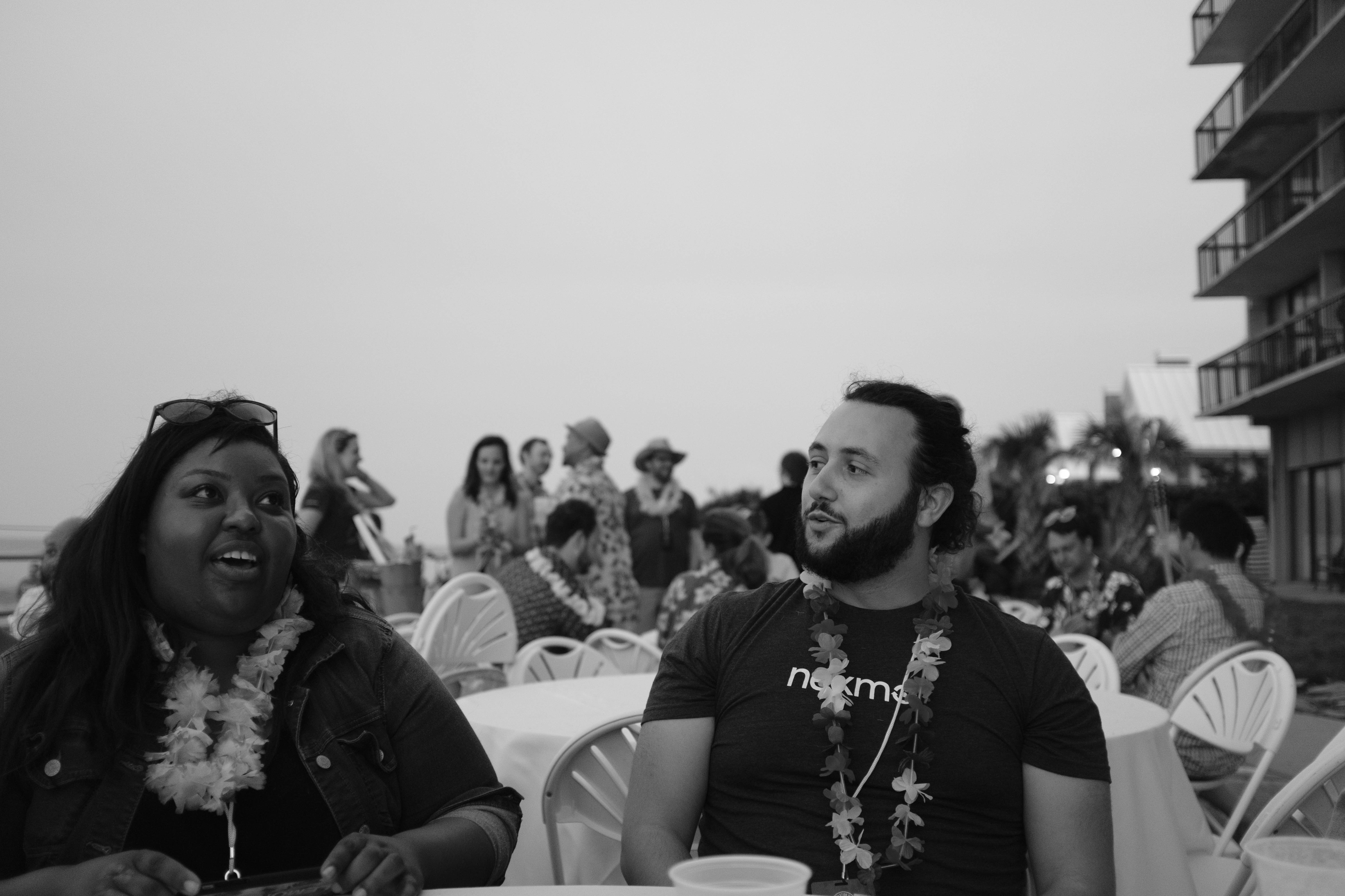 In a lively outdoor setting, two friends engage in animated conversation, their expressions brightening the somewhat muted surroundings. The black and white composition emphasizes their connection, while softly blurred figures in the background suggest a festive gathering. Subtle lighting captures the relaxed mood of the evening, inviting the viewer into this warm moment of camaraderie.