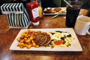 The photograph presents a vibrant breakfast plate, featuring golden hash browns, savory sausage patties, and a fluffy omelet adorned with fresh spinach and tomatoes. The warm, inviting colors of the food contrast with the cool tones of the background, creating a cozy diner atmosphere. The playful arrangement of condiments adds an element of nostalgia, enhancing the overall comfort of a classic breakfast experience.