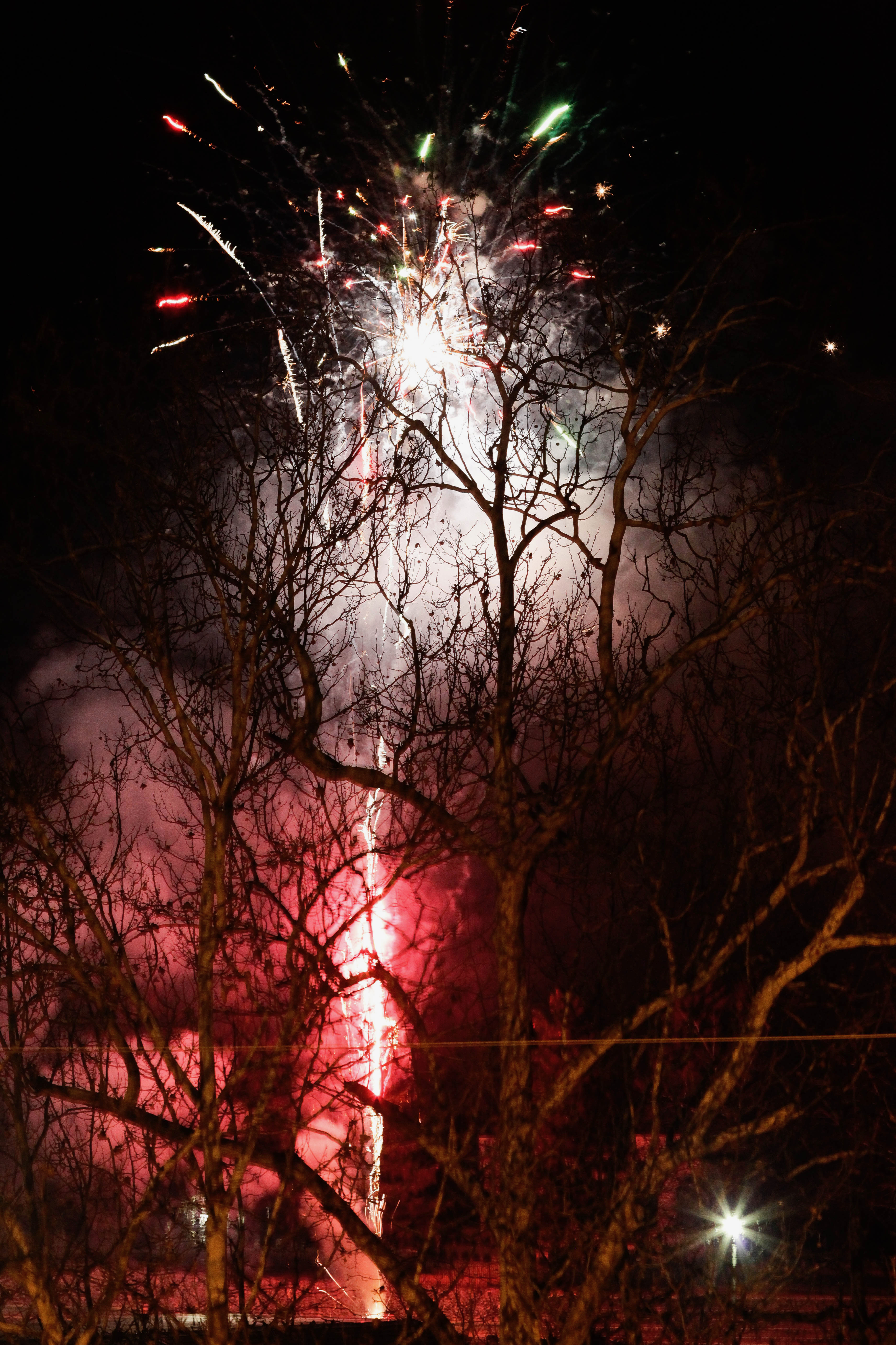 This photograph captures a brilliant display of fireworks bursting through a web of dark, bare branches, creating a striking contrast between light and shadow. The vibrant colors of reds and greens illuminate the night sky, evoking a sense of celebration amid the tranquil darkness. The smoke adds depth and a dreamy quality, enhancing the overall festive mood of the scene.