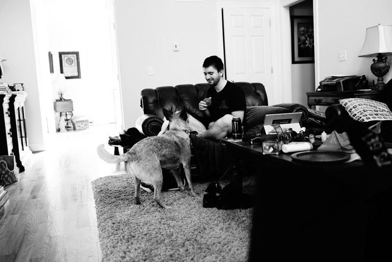 In this intimate black-and-white photograph, a man sits comfortably on a couch, sharing a joyful moment with his dog. The cozy living room setting, enhanced by soft natural light streaming in, creates a warm and inviting atmosphere filled with companionship and tranquility. The composition highlights the bond between the two subjects, capturing a playful exchange amidst a cluttered but lived-in space.