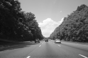 This black-and-white photograph captures a serene highway flanked by dense trees, drawing the viewer's eye down the road. The contrast of light and dark emphasizes the lush foliage, while the scattered clouds add texture to the expansive sky above. The composition evokes a sense of calmness and introspection, inviting thoughts of travel and freedom.