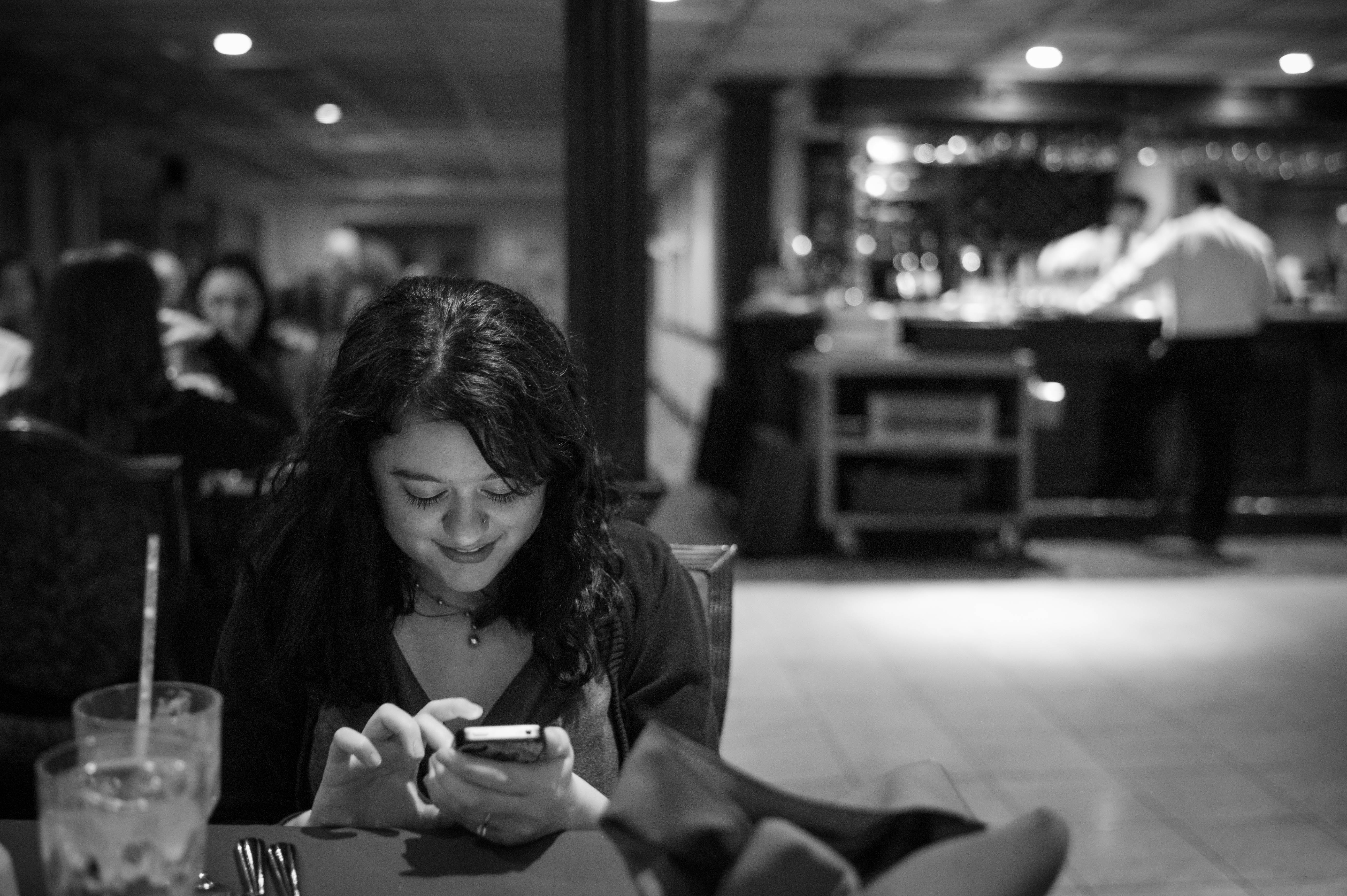This monochromatic photograph captures a young woman engrossed in her phone, a soft smile lighting up her face amidst the ambient glow of a restaurant. The blurred background suggests a lively setting, contrasting her intimate engagement with the screen, which adds a layer of introspection to the scene. The mood is a blend of warmth and solitude, enhanced by soft lighting that softly frames her figure and expressions.