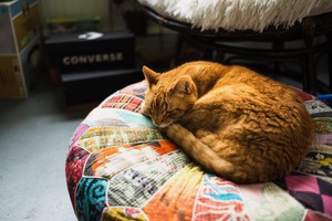 A serene moment captures an orange cat curled up on a colorful, patchwork cushion, embodying tranquility. Soft, natural light bathes the scene, accentuating the cat’s vibrant fur and the intricate patterns of the cushion. The surrounding environment hints at a cozy indoor space, enhancing the overall sense of comfort and peace.
