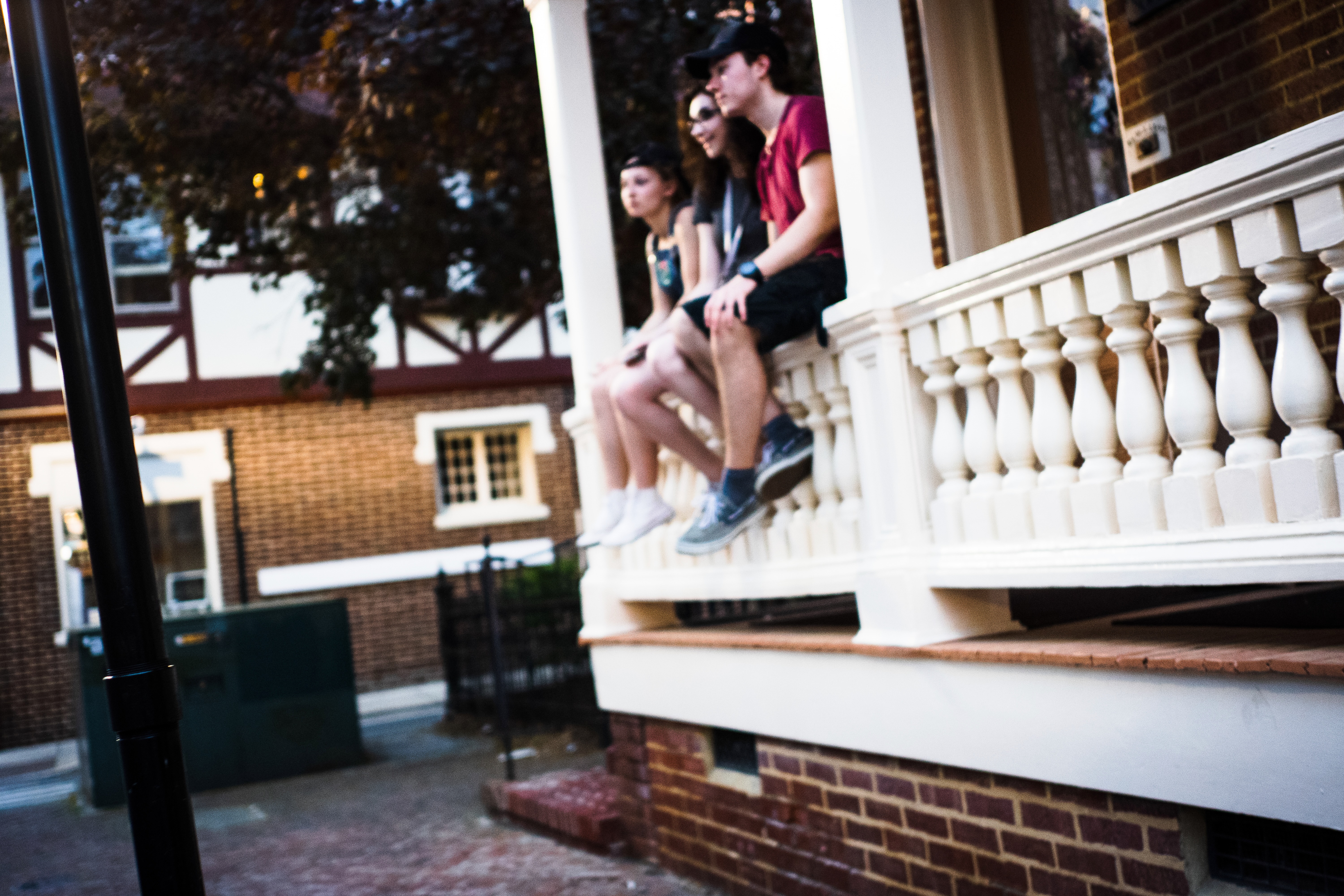 Three friends sit casually on a porch, their silhouettes softly illuminated by the ambient light of late afternoon. The blurred focus creates a dreamy quality, enhancing the relaxed mood as they share laughter and companionship. The brick backdrop and architectural details add a charming, timeless character to the scene.