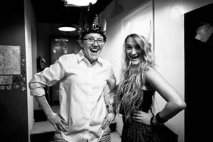 The photograph captures two friends beaming with excitement, framed in a playful, lively indoor setting. The high contrast black-and-white lighting enhances their joyful expressions and the festive atmosphere, while the various decorations hint at a celebration. Their poses and smiles radiate spontaneity and camaraderie, inviting viewers into their moment of fun.