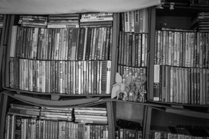 A monochromatic glimpse into a well-loved media collection, this photograph showcases shelves brimming with DVDs and CDs, highlighting a sense of nostalgia and personal history. The soft lighting accentuates the textures of the spines, while a few whimsical figurines stand playfully amidst the rows, adding character and charm. The arrangement feels intimate, inviting viewers to imagine the stories behind each item.