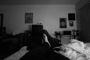 The photograph captures a glimpse of a dimly lit bedroom, focusing on a partially visible foot resting on an unmade bed. The soft contrast of light and shadow creates an introspective mood, while the scattered belongings hint at a lived-in space. The composition draws the eye toward the distant figures and wall art, evoking a sense of solitude and reflection.