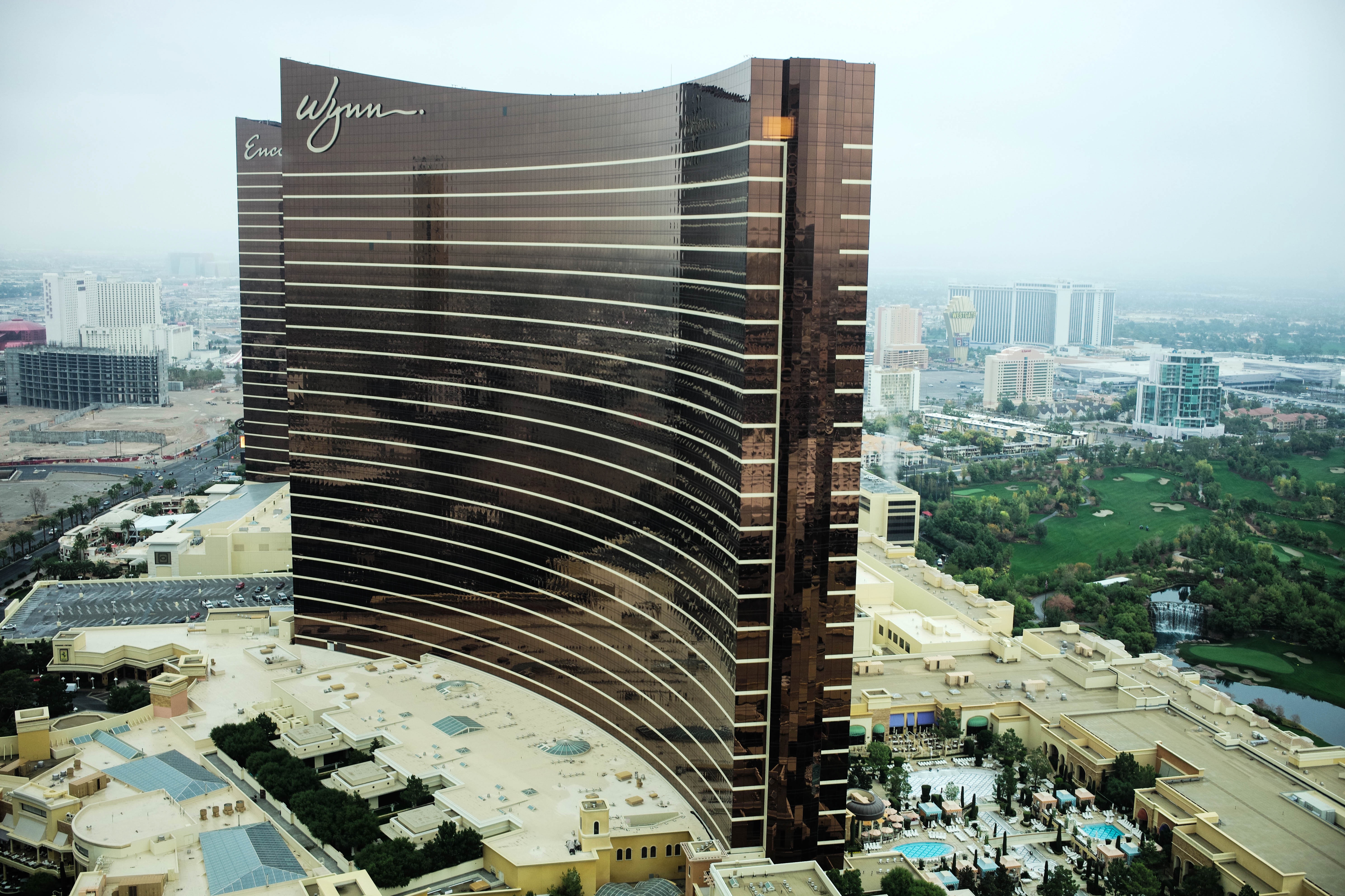 This photograph captures the striking silhouette of the Wynn hotel, its curvilinear facade glimmering under overcast skies. The muted light creates a moody atmosphere, accentuating the building's reflective surfaces and contrasting with the lush greenery below. From this elevated perspective, the composition emphasizes both the grandeur of the structure and its integration into the surrounding urban landscape.