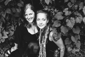 In a striking black-and-white photograph, two women share an intimate moment, framed by lush green foliage that serves as a dramatic backdrop. Their soft smiles convey warmth and friendship, while the natural light accentuates their features, creating a serene and contemplative mood. The composition highlights their connection to each other and nature, inviting viewers to feel a sense of harmony and togetherness.