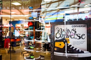 The photograph captures a vibrant display of Converse sneakers in a storefront, showcasing various styles arranged in a visually appealing manner. Bright lighting enhances the lively atmosphere, while the reflection on the glass creates a sense of depth and urban energy. The overall mood is youthful and dynamic, drawing attention to the iconic brand's playful spirit.