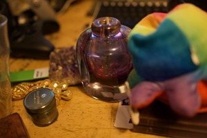 The photograph captures a cluttered workspace, highlighted by a translucent purple vase that glimmers softly in the warm light. A sense of nostalgia permeates the scene, with various personal items arranged haphazardly, suggesting stories and memories woven into each object. The overall mood is intimate yet chaotic, evoking a glimpse into a creative mind at work.