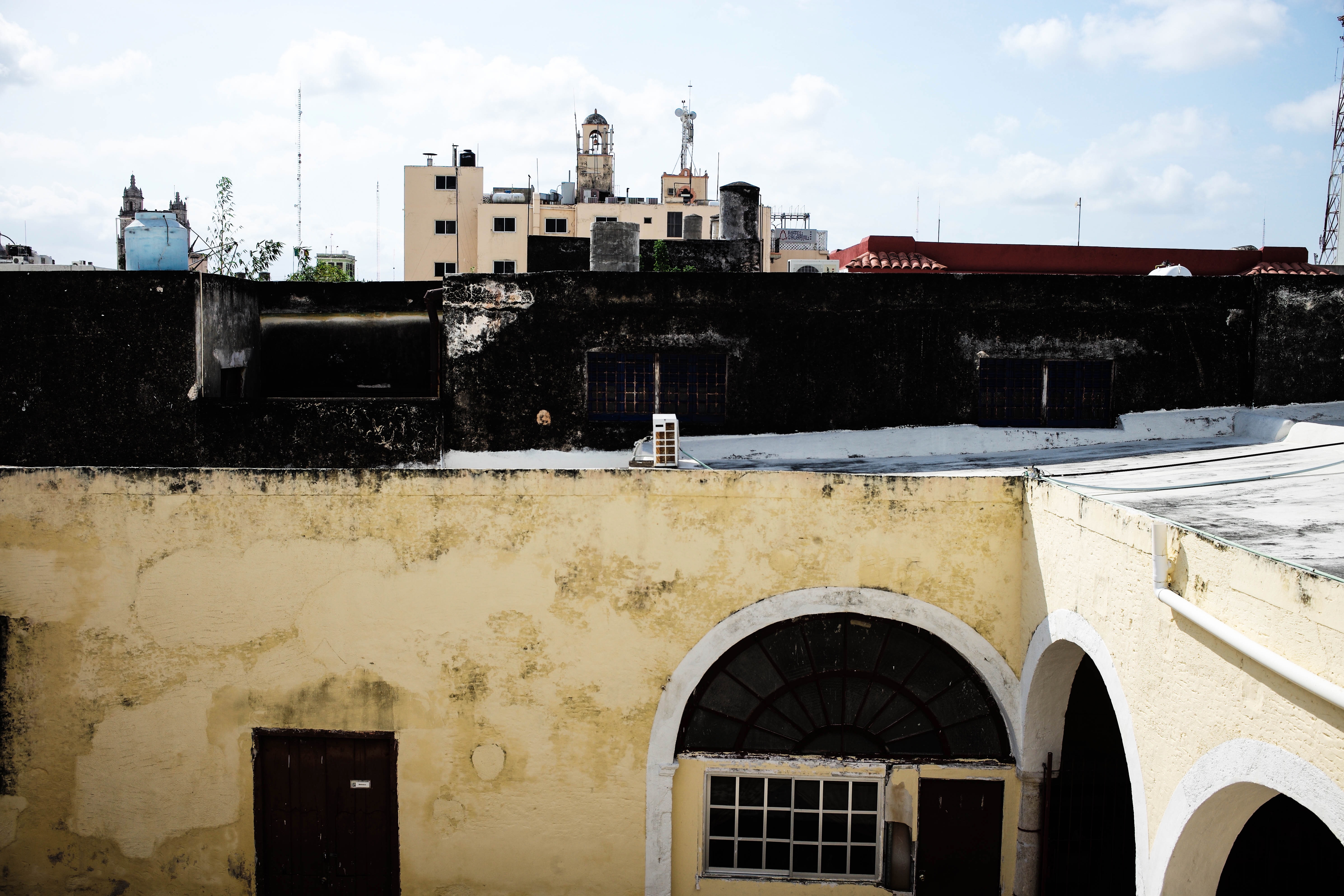 This photograph captures a layered urban landscape, showcasing the contrast between weathered yellow walls and the distant skyline. The soft, diffused sunlight bathes the scene, evoking a sense of nostalgia while hints of modern architecture peek through. The composition is a harmonious blend of texture and geometry, reflecting a city's quiet yet vibrant character.