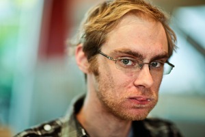In this intimate portrait, a young man gazes directly at the camera, his cheeks full as if caught mid-bite. The soft, diffused lighting enhances his thoughtful expression, while the blurred background adds a sense of depth, isolating him in a moment of reflection. The composition, with his plaid shirt contrasting subtly against warm tones, evokes a casual yet poignant atmosphere.