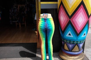 A striking mannequin showcases colorful rainbow tie-dye pants, exuding a playful and lively mood. The bright hues contrast beautifully with the intricate geometric patterns of the nearby painted column, creating an eye-catching composition. Sunlight envelops the scene, enhancing the vividness of the colors and inviting onlookers to immerse in the vibrant atmosphere.